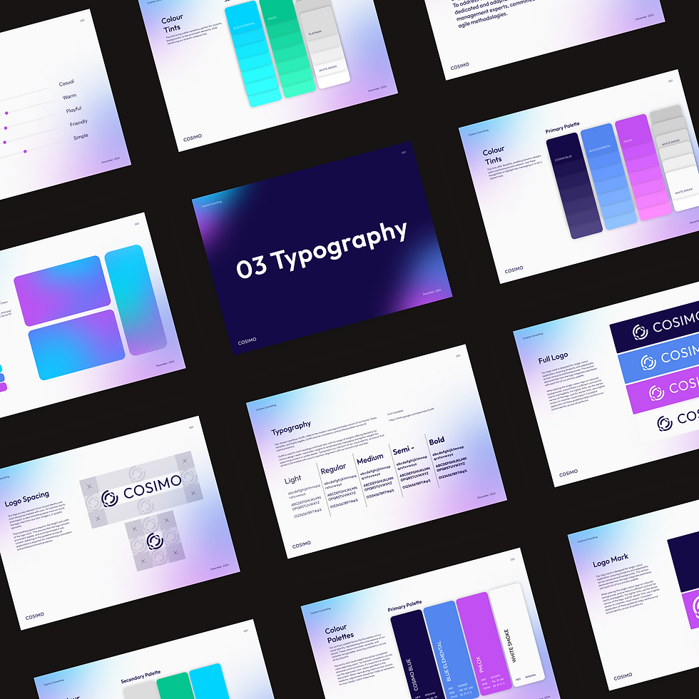 The project began with a series of workshops and competitor reviews to understand how similar consultancies positioned themselves. I evaluated tone, visual cues, structure and content patterns across the sector, identifying opportunities for Cosimo to present a cleaner, more modern voice. From this, I developed a brand direction centred around clarity, confidence and a minimal visual language that avoided overly corporate tropes while still feeling premium.